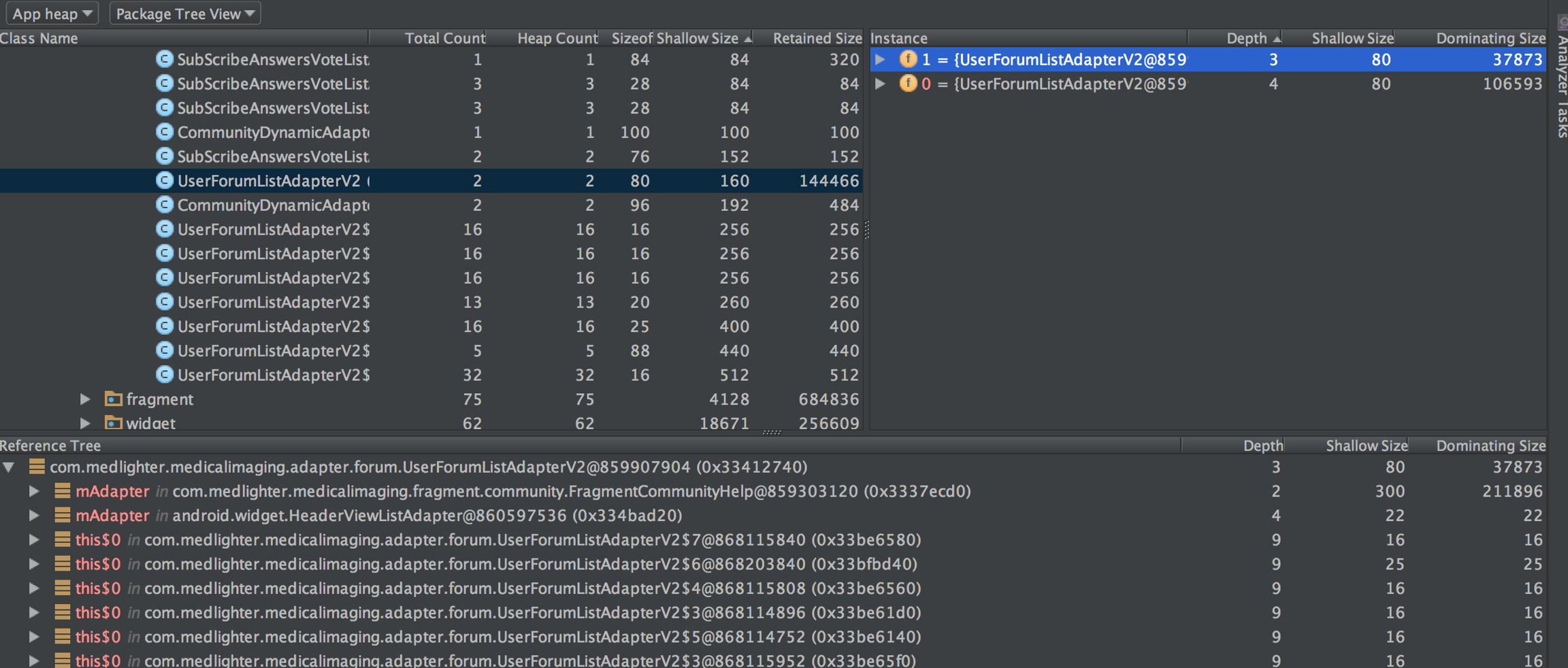 可以看出两个hprof的数据对象对比结果。 通过这种方式可以快速定位到操作前后所持有的对象增量,从而进一步定位出当前操作导致内存泄露的具体原因是泄露了什么数据对象。